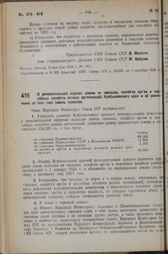 Постановление Совета Народных Комиссаров. О дополнительной отрезке земель от совхозов, хозяйств орс'ов и подсобных хозяйств разных организаций Куйбышевского края и об увеличении за этот счет земель колхозов. 4 октября 1936 г. № 1799