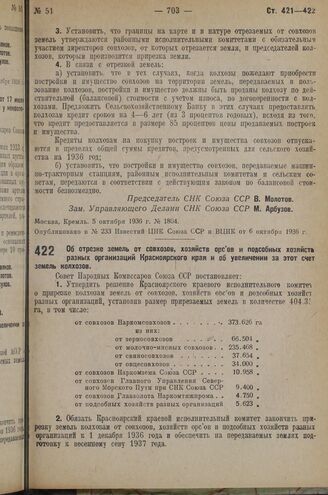 Постановление Совета Народных Комиссаров. Об отрезке земель от совхозов, хозяйств орс'ов и подсобных хозяйств разных организаций Красноярского края и об увеличении за этот счет земель колхозов. 5 октября 1936 г. № 1803