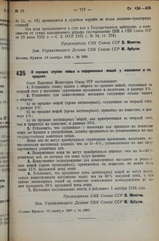 Постановление Совета Народных Комиссаров. О порядке скупки новых и подержанных вещей у населения и их продаже. 13 октября 1936 г. № 1852