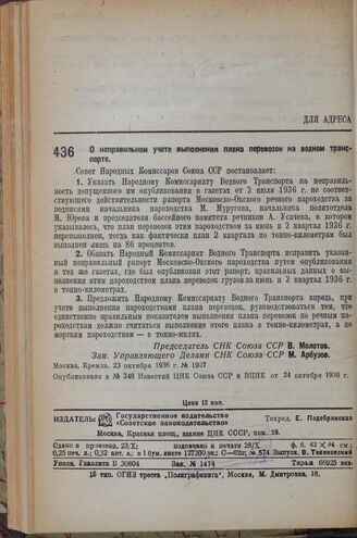 Постановление Совета Народных Комиссаров. О неправильном учете выполнения плана перевозок на водном транспорте. 23 октября 1936 г. № 1907