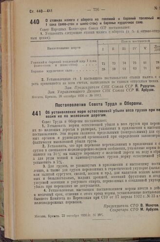Постановление Совета Народных Комиссаров. О ставках налога с оборота на говяжий и бараний топленый жир 1 сока (олео-сток и шипс-сток) и баранье курдючное сало. 26 октября 1936 г. № 1913