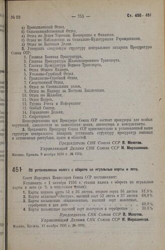 Постановление Совета Народных Комиссаров. Об установлении налога с оборота на игральные карты и лото. 13 ноября 1936 г. № 1970