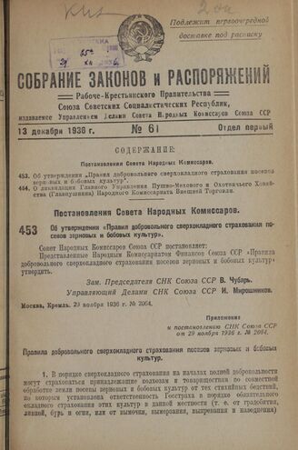 Постановление Совета Народных Комиссаров. Об утверждении «Правил добровольного сверхокладного страхования посевов зерновых и бобовых культур». 29 ноября 1936 г. № 2064