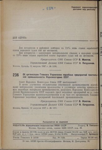 Постановление Совета Народных Комиссаров. Об организации Главного Управления подсобных предприятий текстильной промышленности Наркомлегпрома СССР. 11 августа 1937 г. № 1351