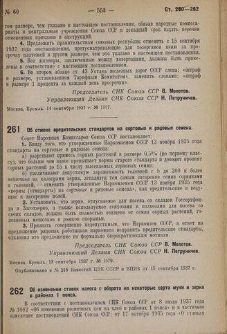 Постановление Совета Народных Комиссаров. Об изменении ставок налога с оборота на некоторые сорта муки и зерна в районах 1 пояса. 11 сентября 1937 г. № 1580
