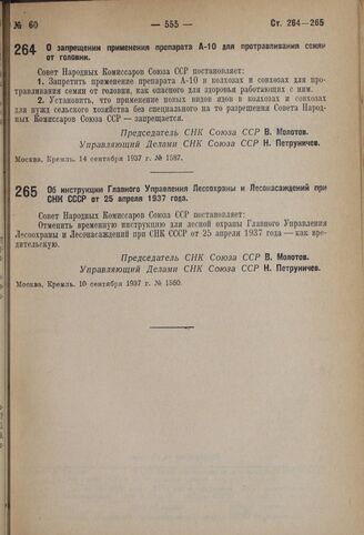 Постановление Совета Народных Комиссаров. О запрещении применения препарата А-10 для протравливания семян от головни. 14 сентября 1937 г. № 1587