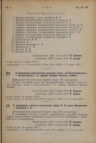 О награждении ответственного редактора газеты «За Индустриализацию» т. Васильковского Г.О. орденом Трудового Красного Знамени. 29 декабря 1936 г.