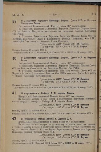 О Заместителе Народного Комиссара Обороны Союза ССР по Морским Силам. 27 января 1937 г. // Опубликовано в № 25 Известий ЦИК Союза ССР и ВЦИК от 28 января 1937 г.
