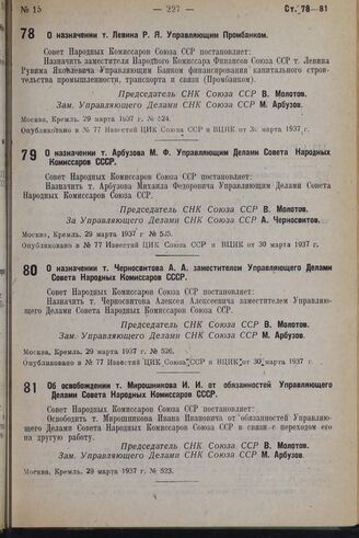 Об освобождении т. Мирошникова И.И. от обязанностей Управляющего Делами Совета Народных Комиссаров СССР. 29 марта 1937 г. № 523