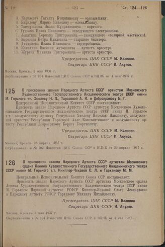 О присвоении звания Народного Артиста СССР артистам Московского ордена Ленина Художественного Государственного Академического театра СССР имени М. Горького т.т. Книппер-Чеховой О.Л. и Тарханову М.М. 3 мая 1937 г. // Опубликовано в № 104 Известий ЦИК Союза ССР и ВЦИК от 4 мая 1937 г.