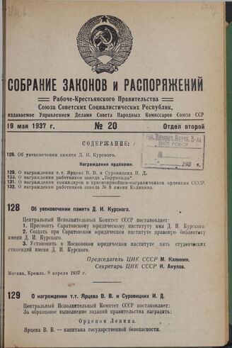 О награждении т.т. Ярцева В.В. и Суровицких И.Д. 5 мая 1937 г. // Опубликовано в № 106 Известий ЦИК Союза ССР и ВЦИК от 6 мая 1937 г.