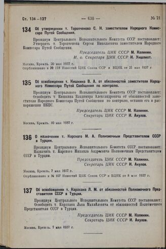 Об освобождении т. Карахана Л.М. от обязанностей Полномочного Представителя СССР в Турции. 1 мая 1937 г.