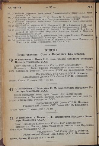 Постановление Совета Народных Комиссаров. О назначении т. Баева С.М. заместителем Народного Комиссара Водного Транспорта СССР. 25 января 1939 г. № 109