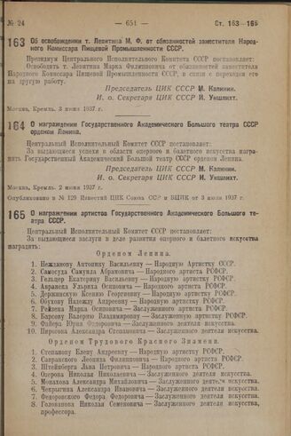 О награждении Государственного Академического Большого театра СССР орденом Ленина. 2 июня 1937 г. // Опубликовано в № 129 Известий ЦИК Союза ССР и ВЦИК от 3 июня 1937 г.