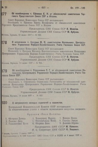Об освобождении т. Струмилина С.Г. от обязанностей заместителя Начальника Центрального Управления Народно-Хозяйственного Учета Госплана Союза ССР. 14 июня 1937 г. № 957