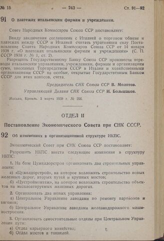Постановление Совета Народных Комиссаров. О платежах итальянским фирмам и учреждениям. 3 марта 1939 г. № 256