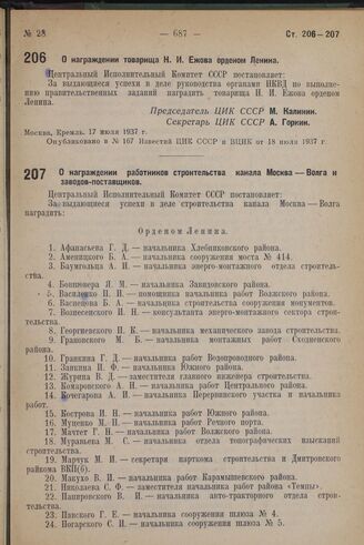 О награждении товарища Н.И. Ежова орденом Ленина. 17 июля 1937 г. // Опубликовано в № 167 Известий ЦИК СССР и ВЦИК от 18 июля 1937 г.