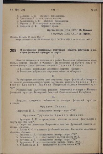 О награждении добровольных спортивных обществ, работников и мастеров физической культуры и спорта. 22 июля 1937 г. // Опубликовано в № 171 Известий ЦИК СССР и ВЦИК от 23 июля 1937 г.
