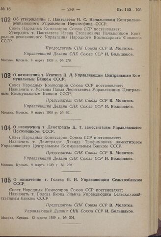 Постановление Совета Народных Комиссаров. О назначении т. Деметрадзе Д.Т. заместителем Управляющего Цекомбанком СССР. 8 марта 1939 г. № 272