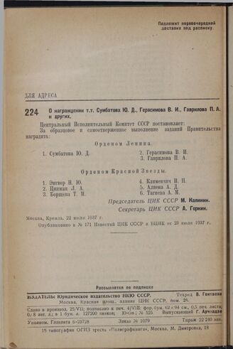 О награждении т.т. Сумбатова Ю.Д., Герасимова В.И., Гаврилова П.А. и других. 22 июля 1937 г. // Опубликовано в № 171 Известий ЦИК СССР и ВЦИК от 23 июля 1937 г.
