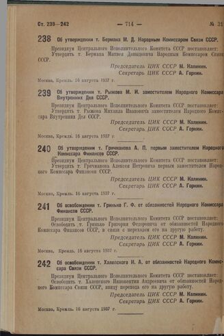 Об утверждении т. Бермана М.Д. Народным Комиссаром Связи СССР. 16 августа 1937 г.
