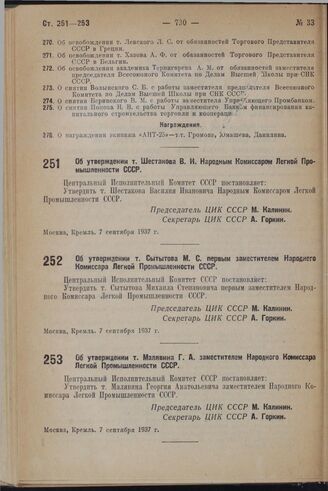 Об утверждении т. Шестакова В.И. Народным Комиссаром Легкой Промышленности СССР. 7 сентября 1937 г.