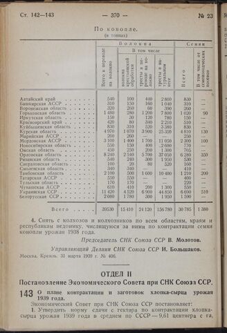 Постановление Экономического Совета при СНК Союза ССР. О плане контрактации и заготовок хлопка-сырца урожая 1939 года. 28 марта 1939 г. № 269