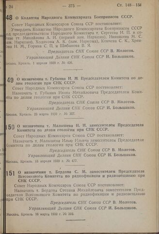 Постановление Совета Народных Комиссаров. О назначении т. Малышева И.И. заместителем Председателя Комитета по делам геологии при СНК СССР. 13 апреля 1939 г. № 477