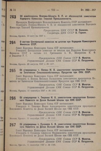 Об утверждении т. Попова М.В. заместителем председателя Комитета по Заготовкам Сельскохозяйственных Продуктов при СНК СССР. 11 сентября 1937 г. № 1562