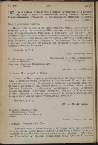 Главная Собрание законов и распоряжений правительства РСФСР и СССР Собрание законов и распоряжений Рабоче-Крестьянского Правительства ... СЗ СССР 39(1) Собрание постановлений и распоряжений правительства СССР за 1939 г.... Документы Обмен нотами о продлении действия Соглашения от 4 августа 1937 года...