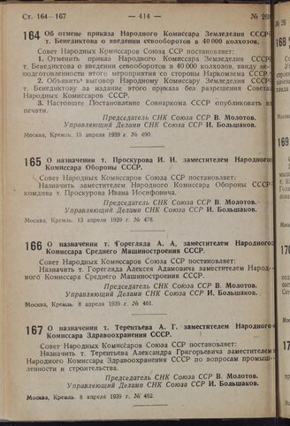 Постановление Совета Народных Комиссаров. О назначении т. Горегляда А.А. заместителем Народного Комиссара Среднего Машиностроения СССР. 8 апреля 1939 г. № 461