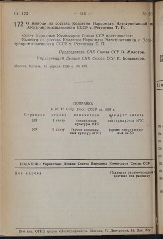 Постановление Совета Народных Комиссаров. О выводе из состава Коллегии Наркомата Электростанций и Электропромышленности СССР т. Регентова Т.П. 13 апреля 1939 г. № 475