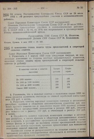 Постановление Совета Народных Комиссаров. Об отмене Постановления Совнаркома Союза ССР от 29 июля 1935 г. «О размерах приусадебных участков в коноплеводческих районах». 4 мая 1939 г. № 609