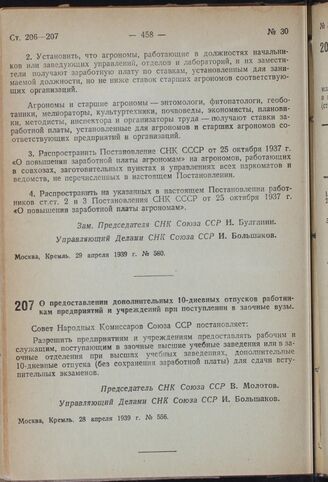 Постановление Совета Народных Комиссаров. О предоставлении дополнительных 10-дневных отпусков работникам предприятий и учреждений при поступлении в заочные вузы. 28 апреля 1939 г. № 556