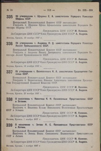 Об утверждении т. Щаденко Е.А. заместителем Народного Комиссара Обороны СССР. 23 ноября 1937 г.