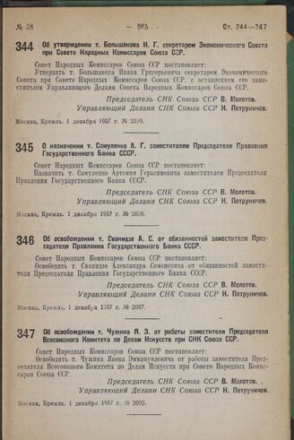 О назначении т. Самуленко А.Г. заместителем Председателя Правления Государственного Банка СССР. 1 декабря 1937 г. № 2098