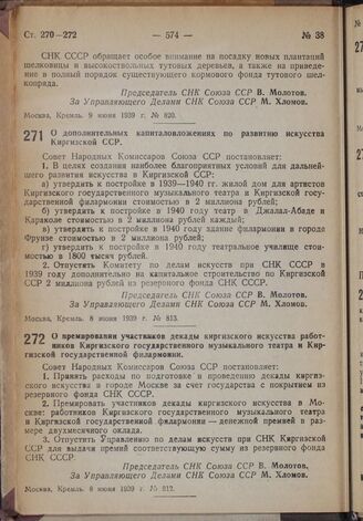 Постановление Совета Народных Комиссаров. О дополнительных капиталовложениях по развитию искусства Киргизской ССР. О дополнительных капиталовложениях по развитию искусства Киргизской ССР. 8 июня 1939 г. № 813