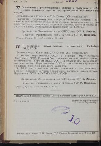 Постановление Экономического Совета при СНК Союза ССР. О реализации лесоматериалов, заготовляемых ГУЛАГом НКВД СССР. 5 января 1940 г. № 27