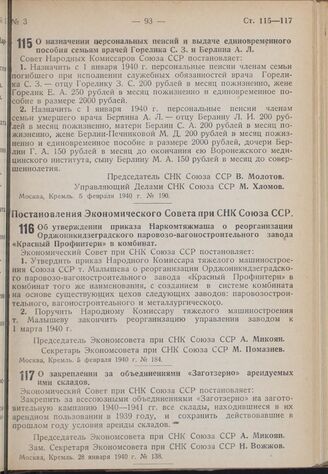 Постановление Экономического Совета при СНК Союза ССР. О закреплении за объединениями «Заготзерно» арендуемых ими складов. 28 января 1940 г. № 138