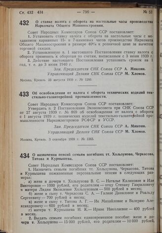 Постановление Совета Народных Комиссаров. Об освобождении от налога с оборота технических изделий текстильно-галантерейной промышленности. 3 сентября 1939 г. № 1365