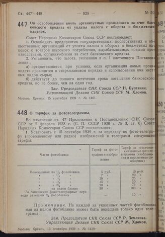 Постановление Совета Народных Комиссаров. Об освобождении вновь организуемых производств за счет банковского кредита от уплаты налога с оборота и бюджетных наценок. 15 сентября 1939 г. № 1461