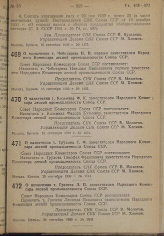 Постановление Совета Народных Комиссаров. О назначении т. Козьмина Ф.К. заместителем Народного Комиссара лесной промышленности Союза ССР. 16 сентября 1939 г. № 1473
