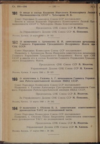 Собрание постановлений и распоряжений правительства СССР за 1940 г. № 1-15. — М., б. г.