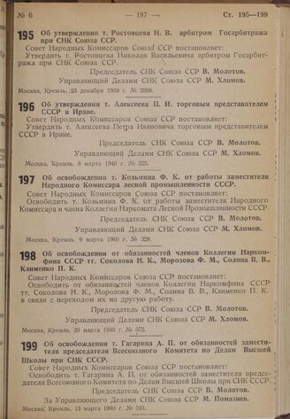 Постановление Совета Народных Комиссаров. Об утверждении т. Алексеева П.И. торговым представителем СССР в Иране. 8 марта 1940 г. № 325