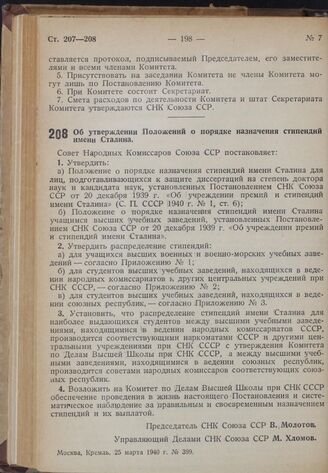 Постановление Совета Народных Комиссаров. Об утверждении Положений о порядке назначения стипендий имени Сталина. 25 марта 1940 г. № 399