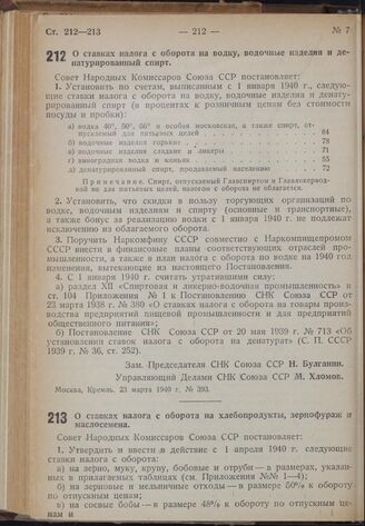 Постановление Совета Народных Комиссаров. О ставках налога с оборота на хлебопродукты, зернофураж и маслосемена. 23 марта 1940 г. № 394