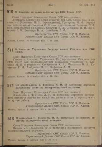 Постановление Совета Народных Комиссаров. О назначении т. Гращенкова Н.И. директором Всесоюзного института экспериментальной медицины. 3 октября 1939 г. № 1614