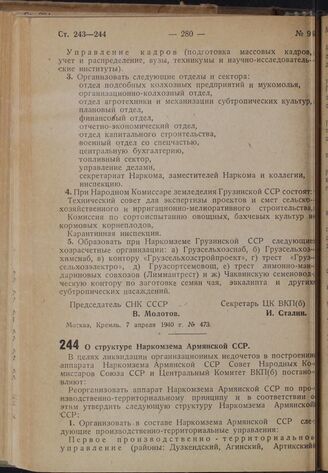 Постановление Совета Народных Комиссаров Союза ССР и Центрального Комитета ВКП(б). О структуре Наркомзема Армянской ССР. 7 апреля 1940 г. № 474