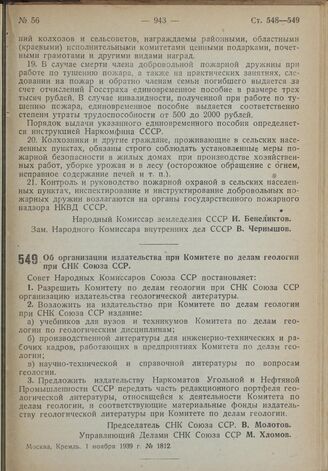 Постановление Совета Народных Комиссаров. Об организации издательства при Комитете по делам геологии при СНК Союза ССР. 1 ноября 1939 г. № 1812