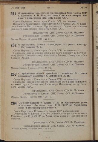 Постановление Совета Народных Комиссаров. О присвоении звания армейского комиссара 2-го ранга корпусному комиссару т. Запорожец А.И. 4 апреля 1940 г. № 443